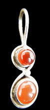 Two spherical stones of calming carnelian set in a spiral pendant. It is said that carnelian helps promote self-confidence and creativity, as well as having a grounding effect.