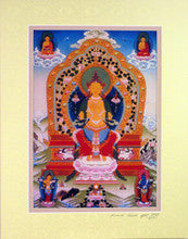 Print of the Buddha Maitreya by Kumar Lama. This print is matted with gold detailed and tan matboard. The image size is 10.25"x7.25" and the matboard is 14"x11".