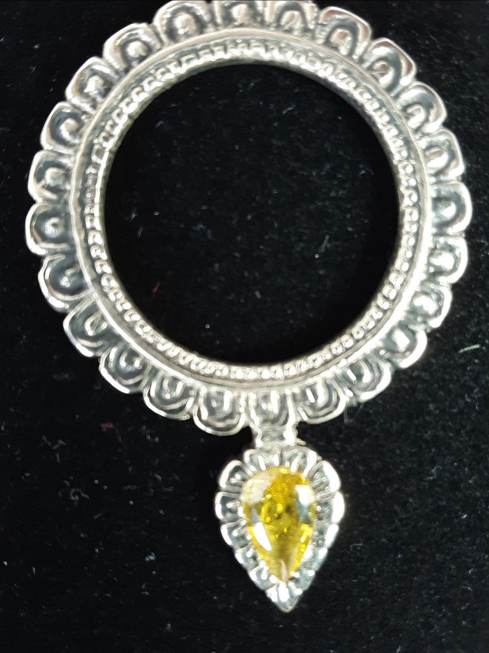 Beautiful pair of etched silver earrings with lovely yellow stone inserts. A traditional design mixed with a flair for the modern yogini.
