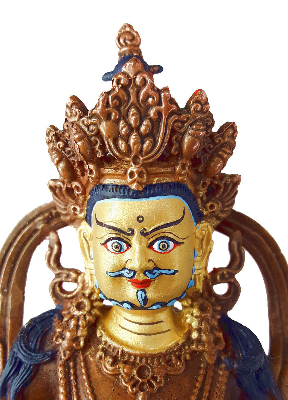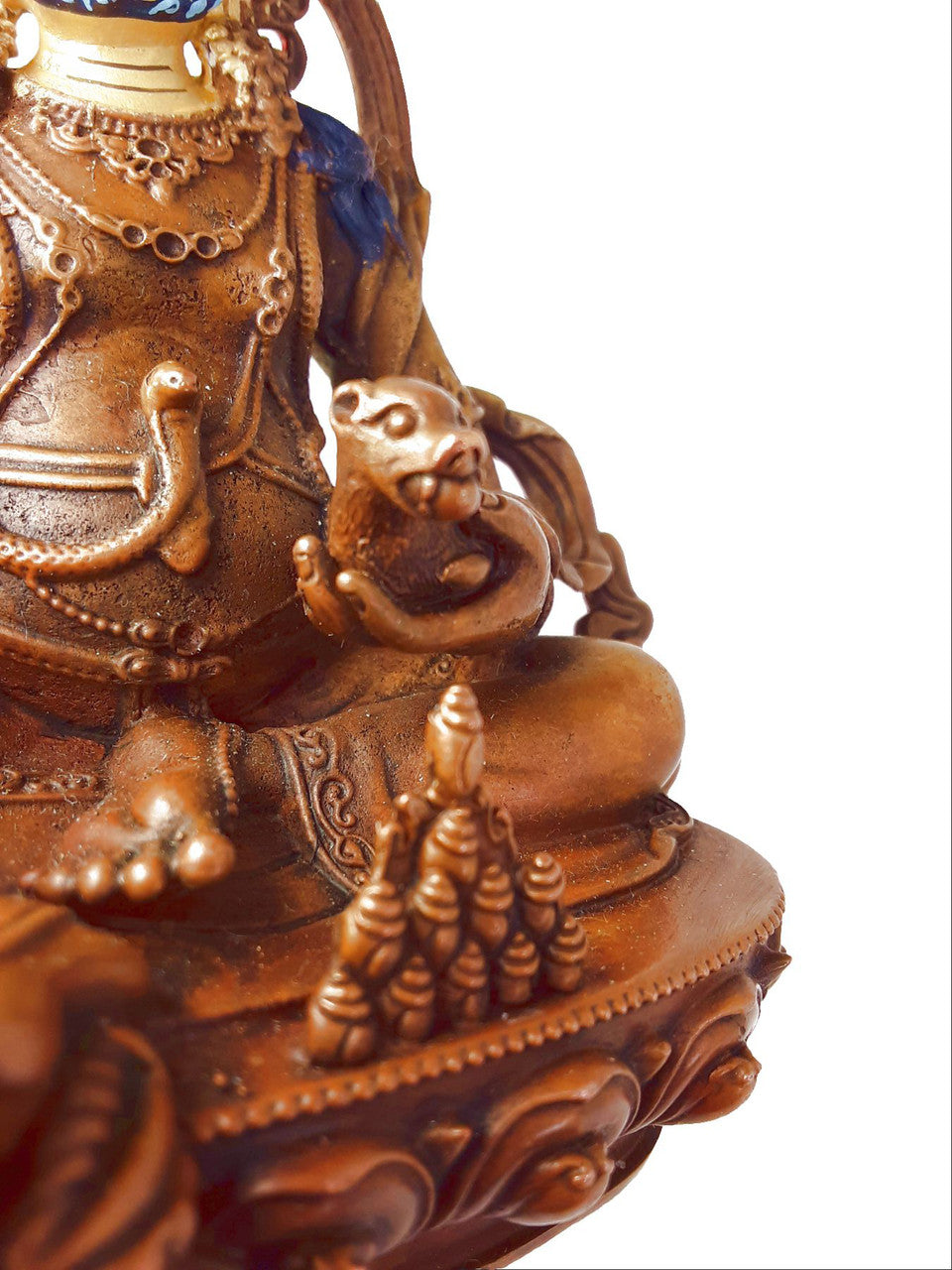 Lovely Copper-Oxidized Dzambhala statue. Dzambhala is the embodiment of the perfect generosity of the Buddhas and Bodhisattvas. The practice of the wealth deity Dzambhala helps to increase prosperity in all forms and remove the suffering of poverty so that practitioners are able to practice the Dharma with ease. Dzambhala's mongoose offers limitless wish-fullfilling gems, symbolic of the true nature of mind. Dzambhala is also another form of Orgyen Khandro Norla, the inner accomplishment practice of Guru Rinpoche in the form of a wealth deity practiced in the Dudjom Lineage.