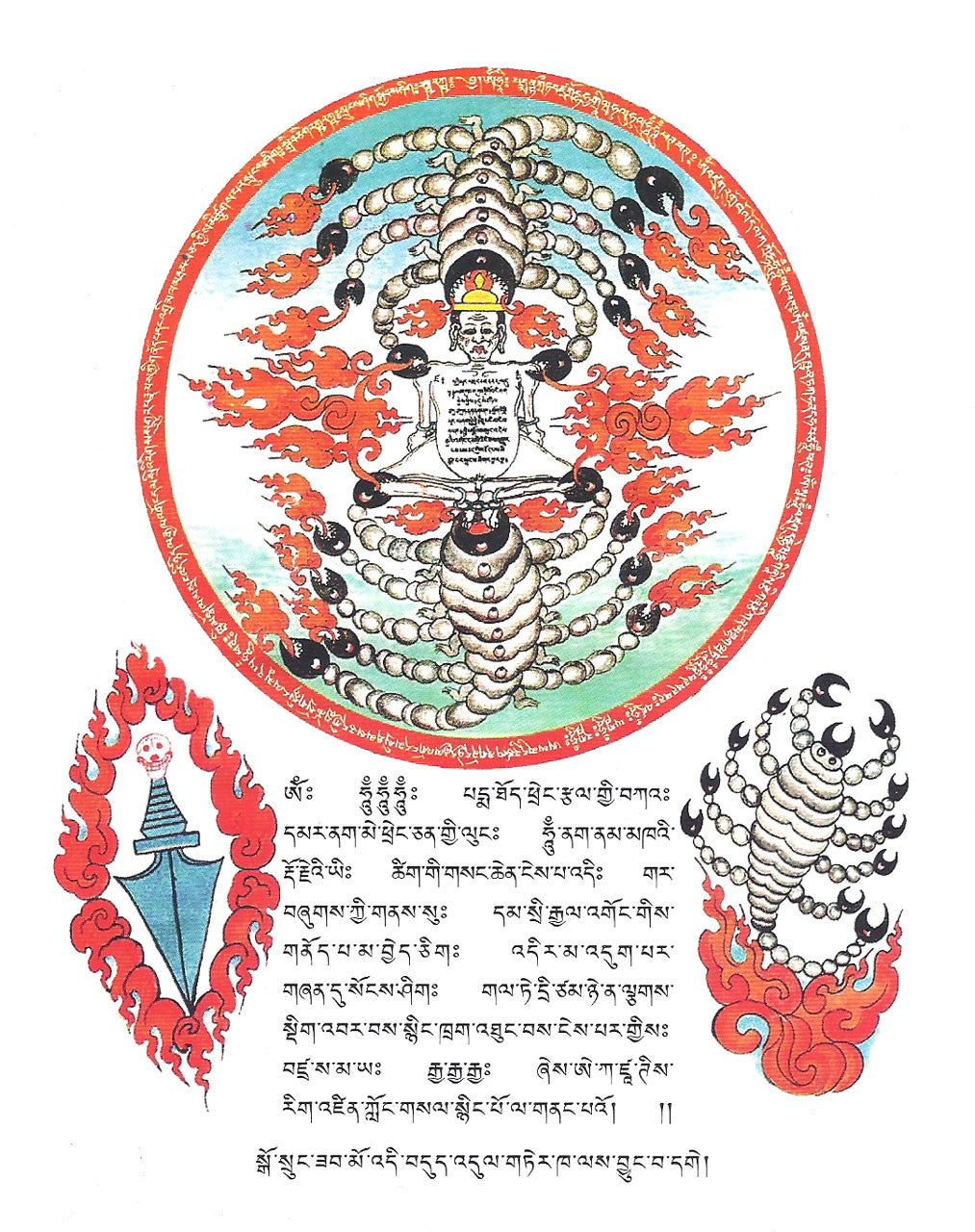 This scorpion door protection mandala is said to remove obstacles and clear away negative energy. It comes from Dudjom Rinpoche’s Mind Terma, and is used for protection against harmful forces.
