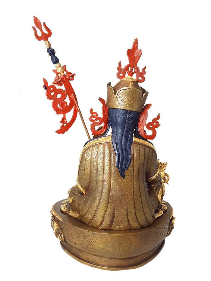 A beautiful gold plated and gilded copper statue of Guru Rinpoche sitting 15 inches tall. Guru Rinpoche, also known as Padmasambhava, helped to establish the Dharma in Tibet in the eighth century by constructing Samye Monastary, the first Buddhist monastary in Tibet. He and his consort, Yeshe Tsogyal, are considered the heart essence of the Dzogchen teachings and the source of the Nyingma school's terma tradition. Every square inch of this statue is beautiful to behold. The gold-plating over specific sections gives the statue a warmth which seems to glow when light touches it. Statues like this are one of a kind. This is a true masterpiece, and a powerful support to inspire your Dharma practice. This statue can be opened for consecration and fillng.