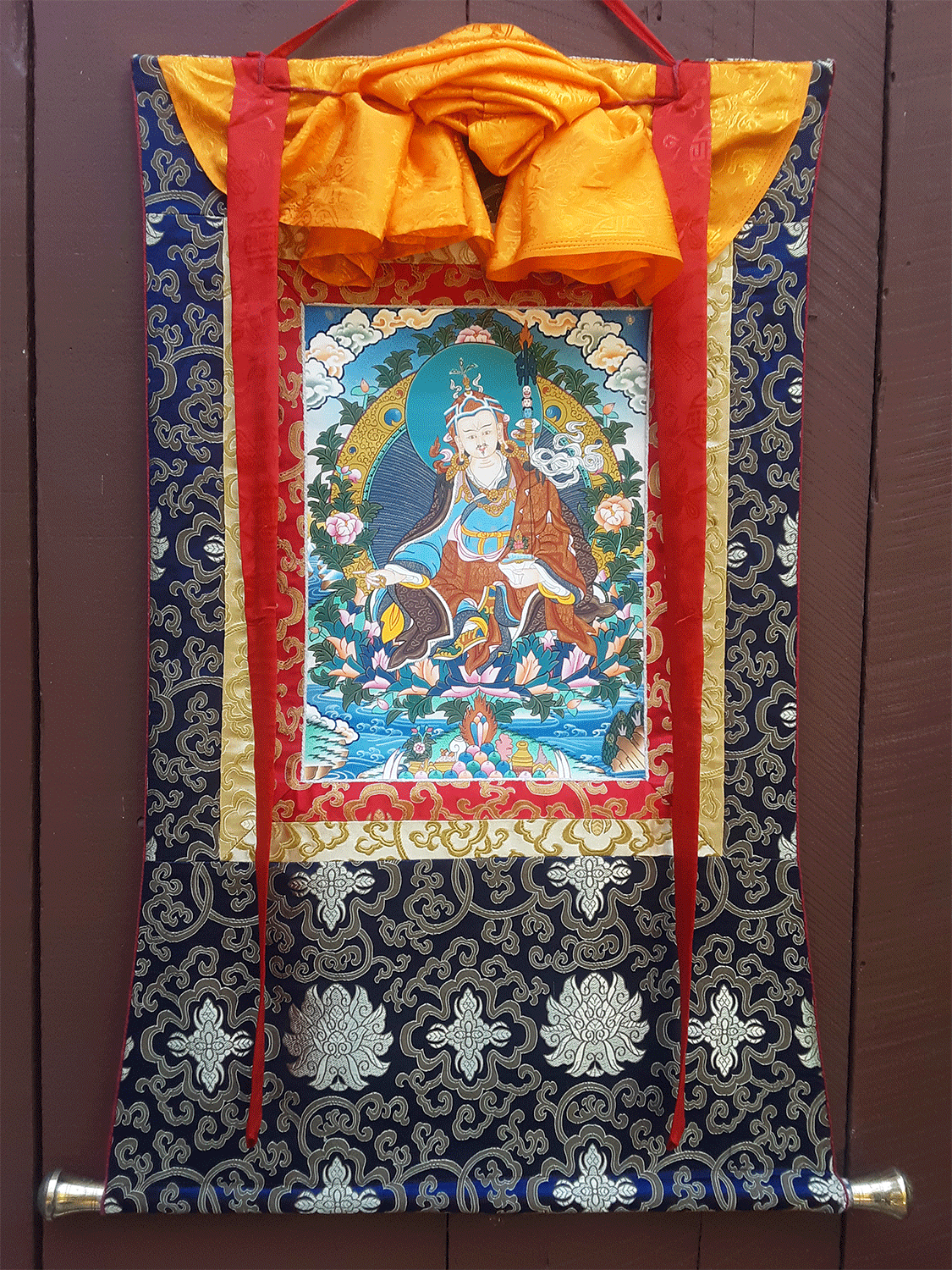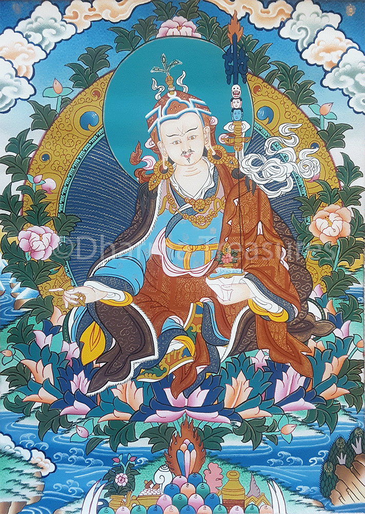 Beautiful handpainted thangka from Nepal depicting the Buddha of our times, Guru Rinpoche. Guru Rinpoche firmly established the Dharma in Tibet so that future generations like ourselves could connect with this potent medicine. To show that he has accomplished his own welfare and is constantly ready to benefit others, he is seated in the graceful posture of royal poise. It is said that just to see an image of Guru Rinpoche has great benefit for one's own path of awakening, for it plants a seed in one's mind stream of future accomplishment.