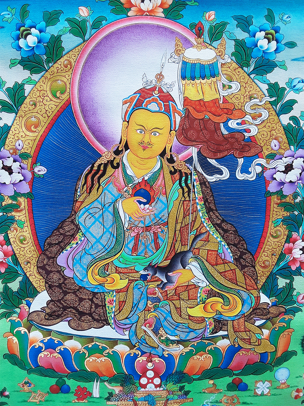 Khandro Norlha is a manifestation of Guru Rinpoche in the form of a wealth deity (Dzambhala.) In H.H. Dudjom Rinpoche's Tsokye Thuk Thik terma cycle, he is the inner guru. Khandro Norlha is a protective deity associated with prosperity, and making offerings to him is said to bring good fortune. He is found throughout many cultures with varying characteristics, but is usually yellow in color. Here he has his characteristic big belly and is holding a jewel-disgorging mongoose in his left hand.