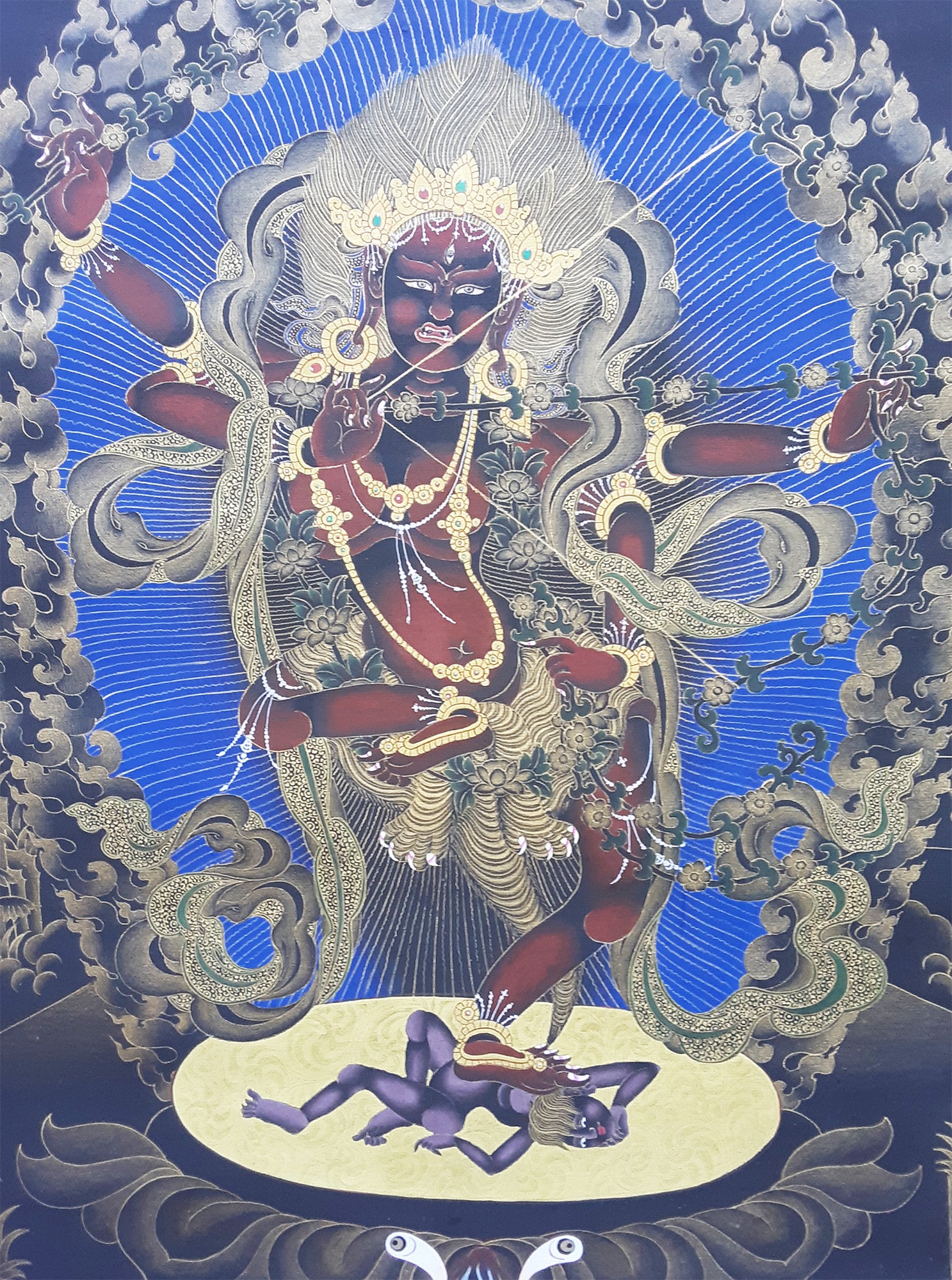 Kurukulle, or Red Tara, is one of the three female emanations of the Buddha Amitabha. Her red color indicates her magnetizing qualities. Her four arms represent the four immeasurable states of mind. She wears a crown of five skulls, signifying the five perfections, and she herself embodies the sixth perfection of wisdom. She vanquishes the fifty negative emotions and manifests compassionate activity in both samsara and nirvana while subjugating the demon of ego and desire. She embodies non-dual wisdom and is unconditioned by discursive thoughts.