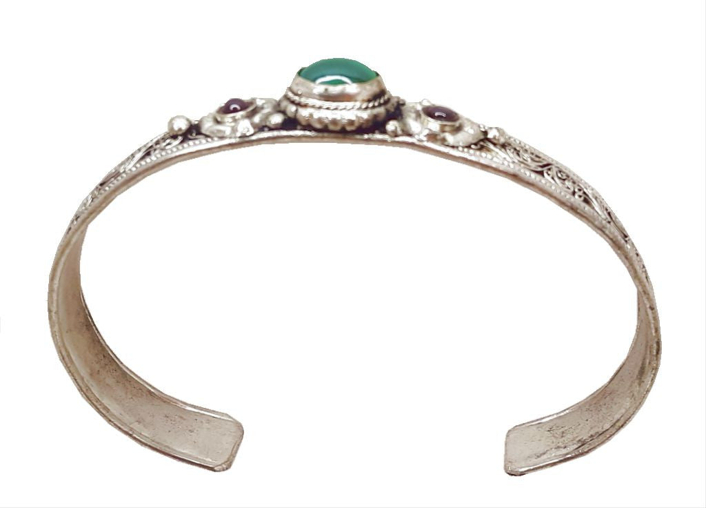 Beautiful white metal bracelet with a large oval malachite and two small garnets inlaid on both sides.