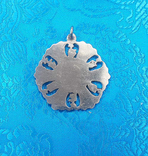White metal mantra medallion with Kalachakra symbol displayed in a mandala with Chenrezig (Avalokitesvara- Sanskrit) is the bodhisattva of compassion mantra circling around. His mantra is Om Mani Padme Hung.