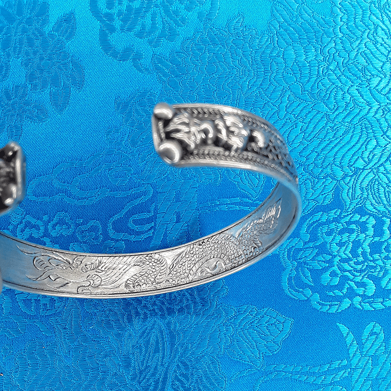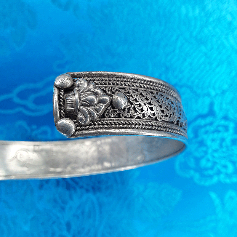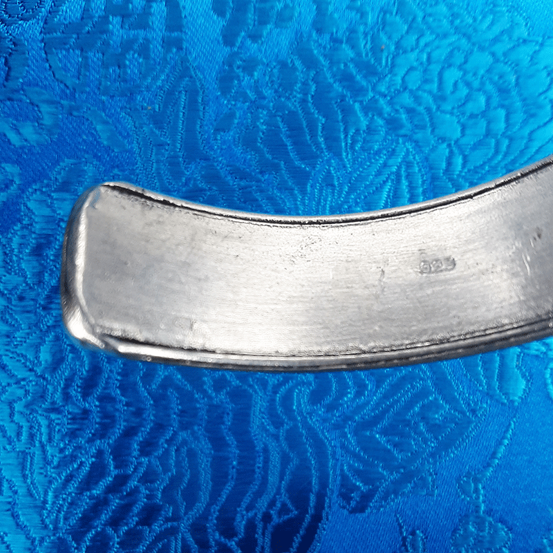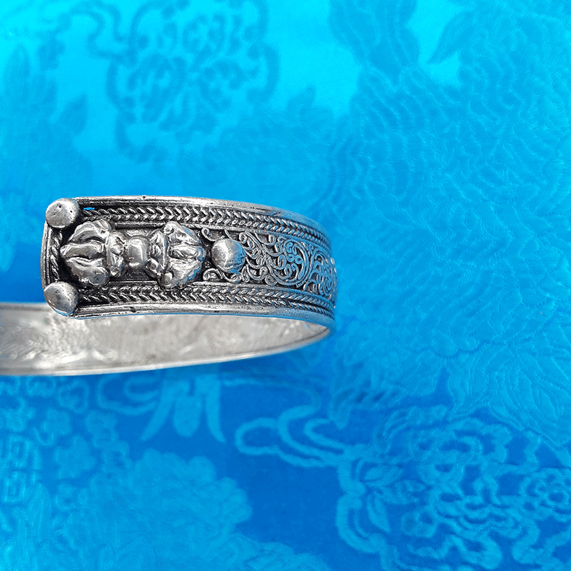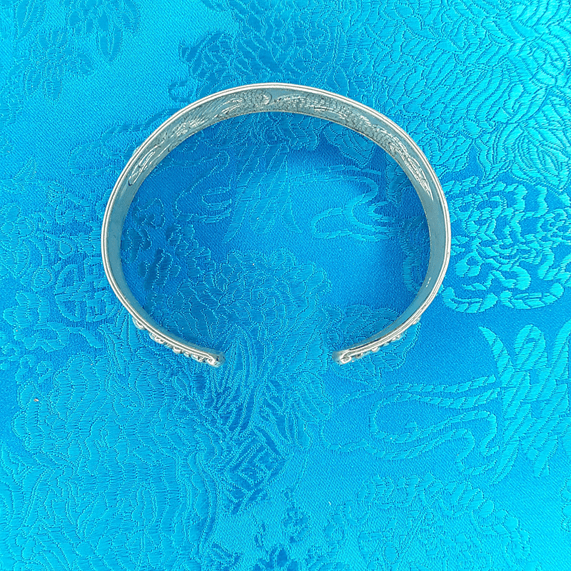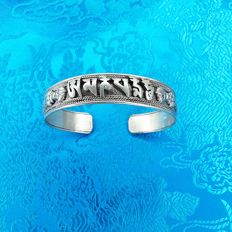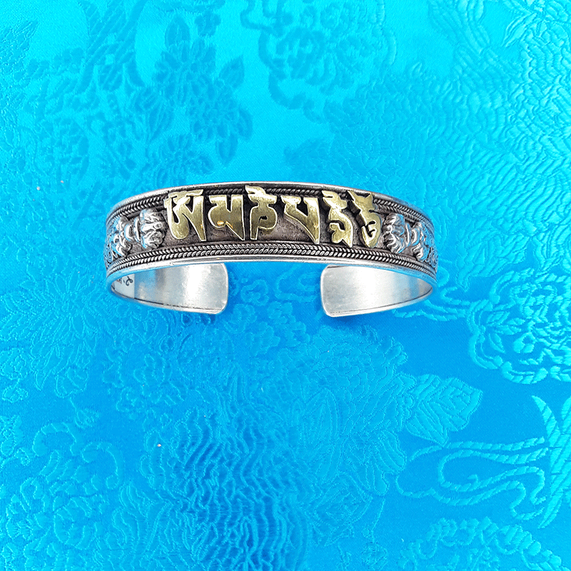 Silver Mani bracelet with "Om Mani Padme Hum" in Tibetan Syllables. There are two styles, one with silver letters, and one with brass. They both have vajras bordering the mantra. The bracelet with silver letters also have vajras on the outer ends of the bracelet, where as the one with brass letters has wish-fulfilling jewels instead. The inside of both styles has an etched dragon. ".925" printed on inside of bracelet in very small numbers.