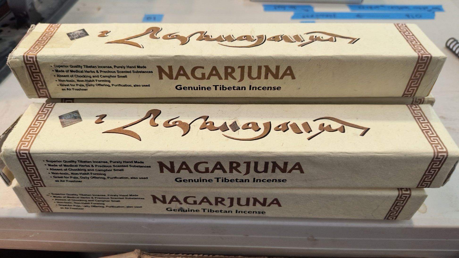 Nagarjuna genuine Tibetan incense is purely hand prepared from highly flavored medicinal herbs and other precious substances. The combination of genuine scented substances makes the Nagarjuna incense richer and of a superior quality than other incenses. The scent while burning is light and clear, and the smoke causes no choking. The manufacturer claims it is non-toxic and non habit forming. Generally, this Tibetan incense is used for puja offering and purification, but it is also used as an air freshener, for an inviting and pleasant surrounding.
