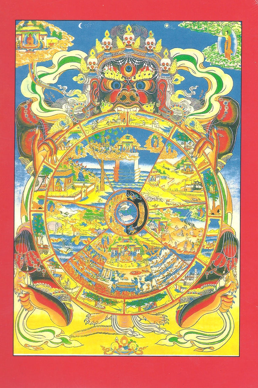The Wheel of Life portrays the Buddhist view of Samsara, the everyday experience of human beings. Yama, the fierce Lord of Death, holds the wheel firmly in his grasp. At the center a pig, rooster and snake – confusion, greed and hatred – chase each other endlessly, binding beings to the cycles of suffering through the power of Karma. The main section of the wheel shows the six realms of existence, reflecting our everyday experience: gods, demigods and humans; animals, hungry ghosts, hell beings. In each realm a Buddha appears to show the way to liberation. In the outer ring are depictions of the twelve links of interdependent origination, starting with ignorance, driven by karma, and activated by consciousness – the dynamic that sustains continued rounds of suffering. When this teaching is understood, this chain can be broken, revealing the way to freedom and inner peace.
