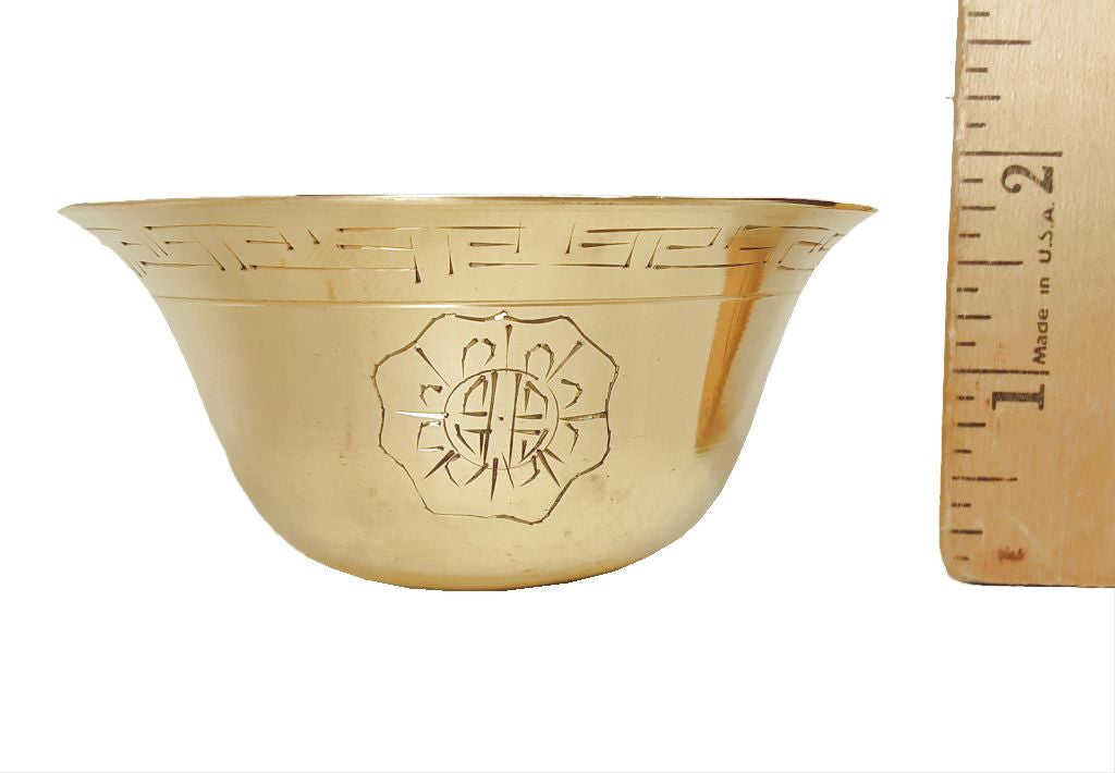 Set of seven brass offering bowls with etched design. Handmade in Nepal by traditional craftsmen.