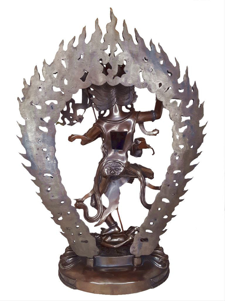 Troma Nagmo (Wrathful Black Mother) is a feminine embodiment of wisdom who liberates all phenomena in its own place-- shattering our ego-clinging. Tröma Nagmo is the innermost secret aspect of the Khandro (Dakini) practice in the Dudjom Tersar lineage. The Chöd practice of Tröma Nagmo provides us with an extremely powerful means to cut through the dualistic clinging of mind, the root of suffering, thus revealing our inherent wisdom nature. Made of a dark copper, found deep within the heart of mother earth, this powerful statue resembles the likeness of Troma Nagmo exquisitely. From the way that her hand delicately holds her driguk (ritual Dakini blade), to her parted lips displaying bared fangs and the backdrop of an arching wall of wisdom fire, this statue is laden with the dynamic imagery that makes wrathful deities so breathtaking to behold. The way her earrings float above her shoulder blades, instead of resting on them, even though the latter would have been easier from a production stand point, just shows that no corners were cut in the process of bringing yet another masterpiece from the Himalayan mountains of Nepal straight to your own shrine.