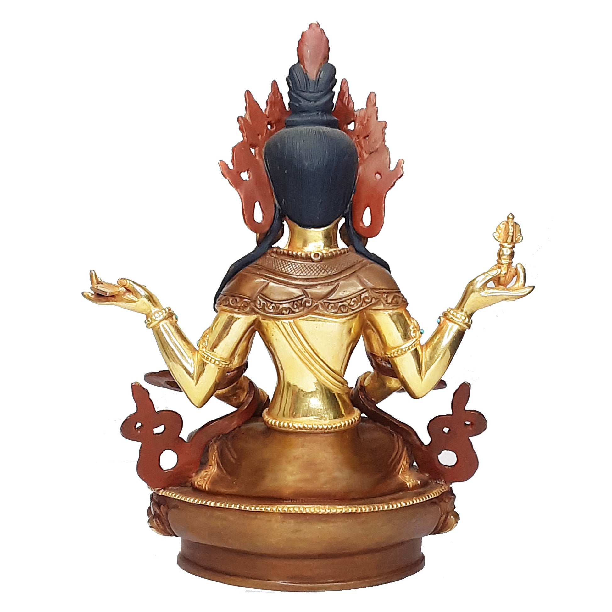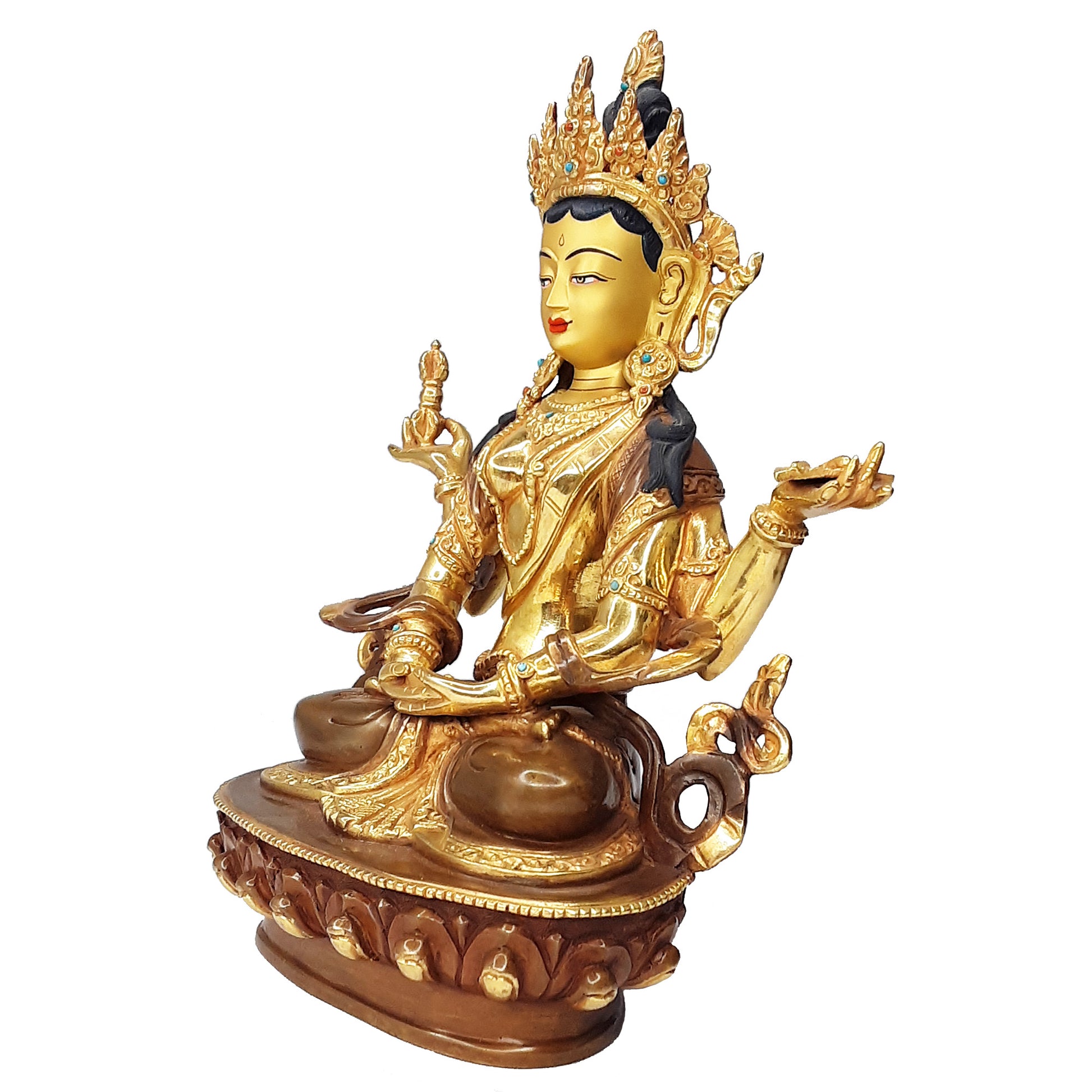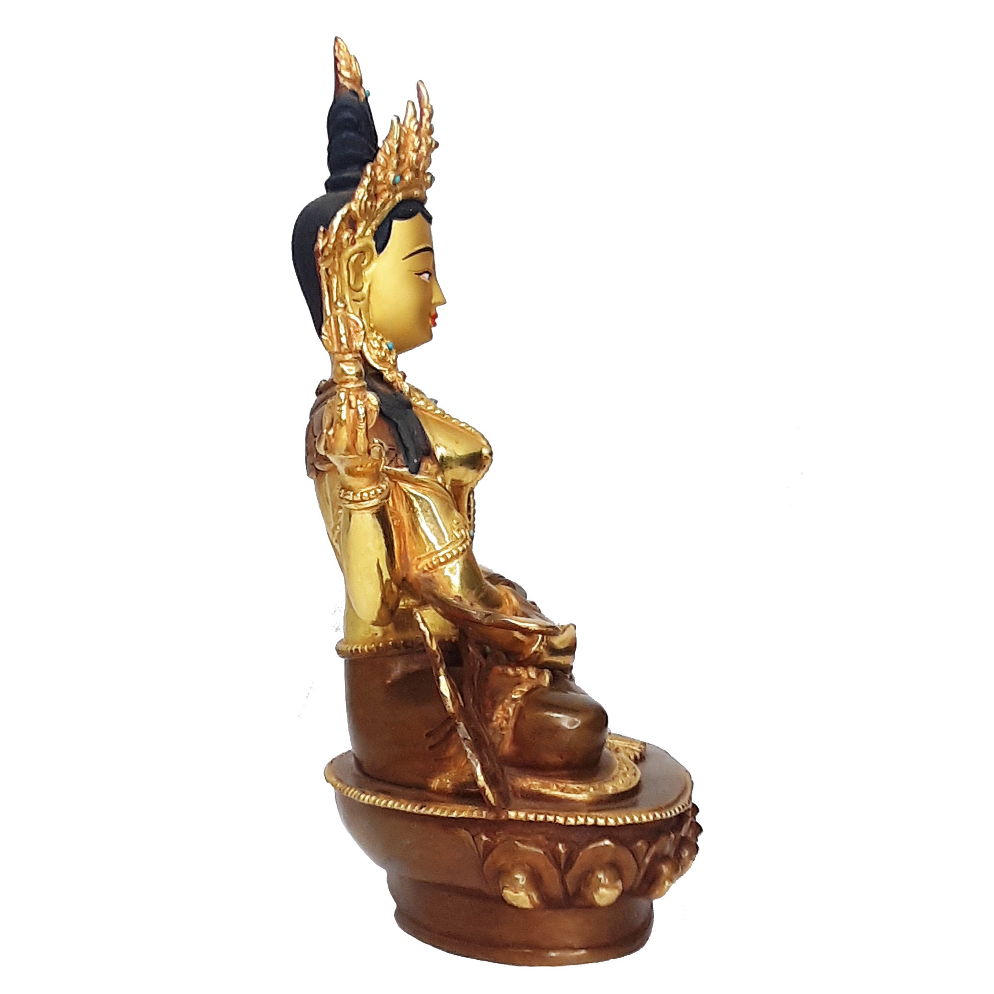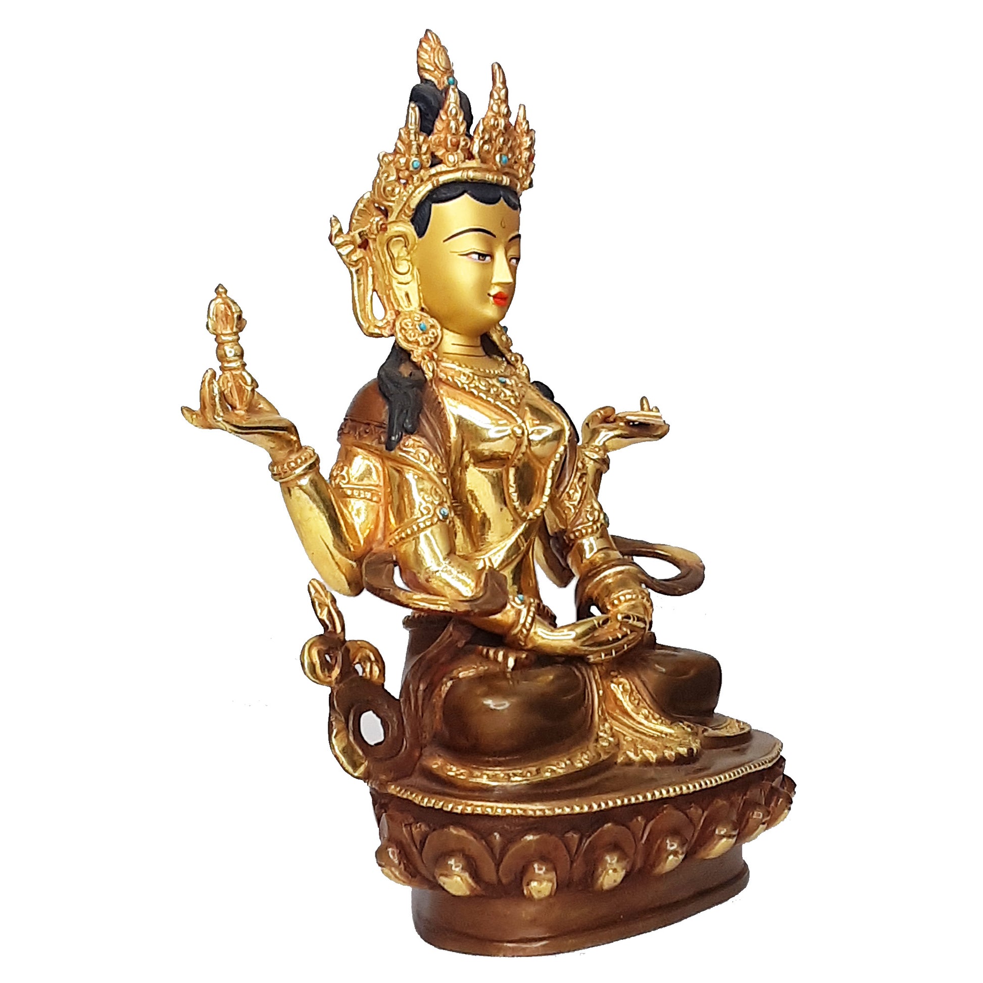 Exquisite gold-plated statue of Prajnaparamita, the mother of all Buddhas. Prajnaparamita translates to "perfection of wisdom," and she represents the absolute wisdom of emptiness. Machik Labron, the founder of Chod practice, is considered to be an emanation of Prajnaparamita.