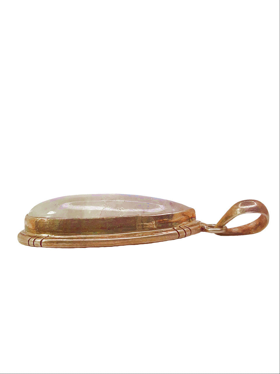 A large tear-drop shaped lavalier pendant made of natural rainbow moonstone with a silver backing. This polished opalescent moonstone glows with a subtle light blue hue accented by an iridescent gleam containing the entire color spectrum. Rainbow moonstone helps promote balance by aligning one's energy with the natural rhythms of nature.