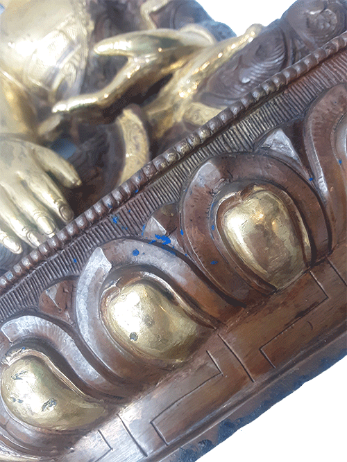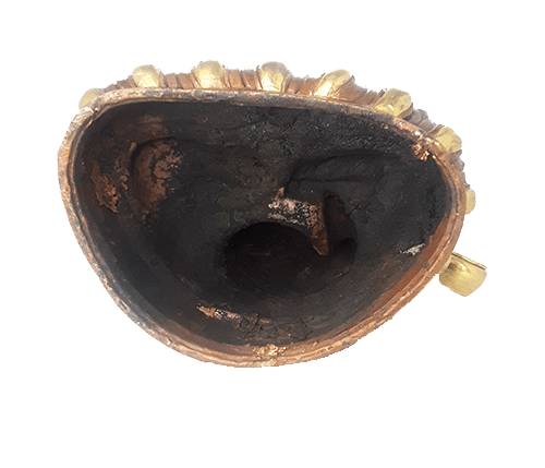The metal sheet that covers the base of the statue is separated (for filling and consecration) and the bowl in his hand can detach as well.