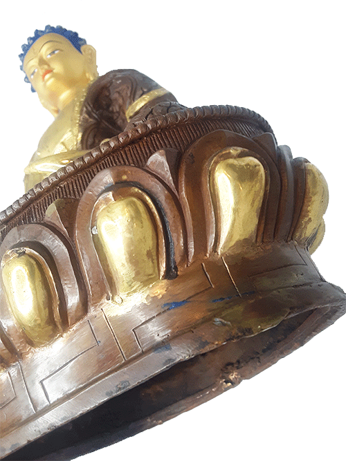 Beautiful previously owned Gold Plated 13.75" Shakyamuni Statue. This statue is a very nice large statue for a shrine or display room. It has signs of aging, and some paint scuffs on the base, but it is a lovely Dharma support nonetheless.