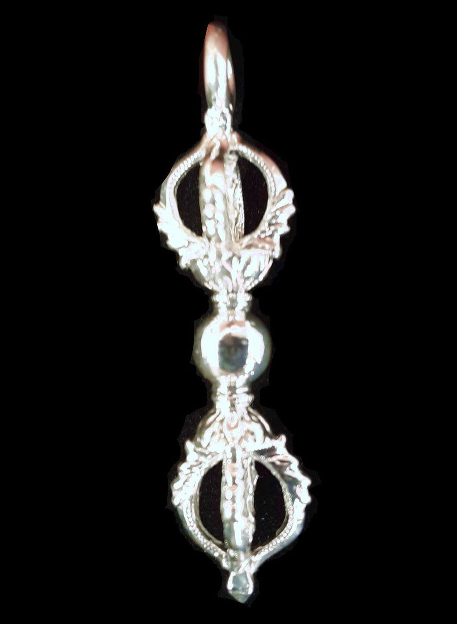 Small silver dorje pendant, handcrafted by Natsog Dorje Artisan Sculpture Studio. Pendant length is approximately 1.75 inches, including bail.