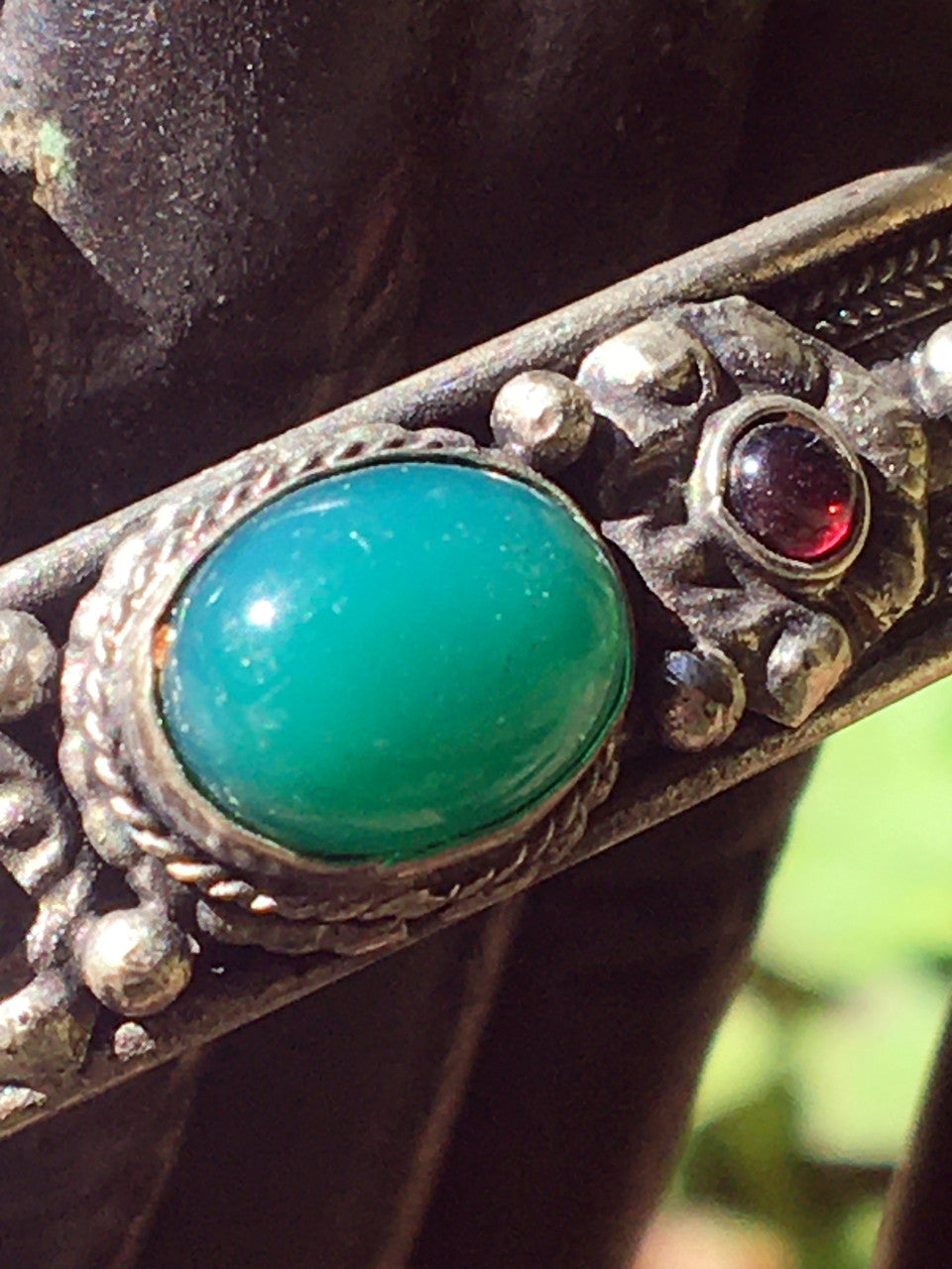 Gorgeous white metal bracelet with jade setting flanked by two delicate maroon stones inlaid in detailing on an ornate engraved band.