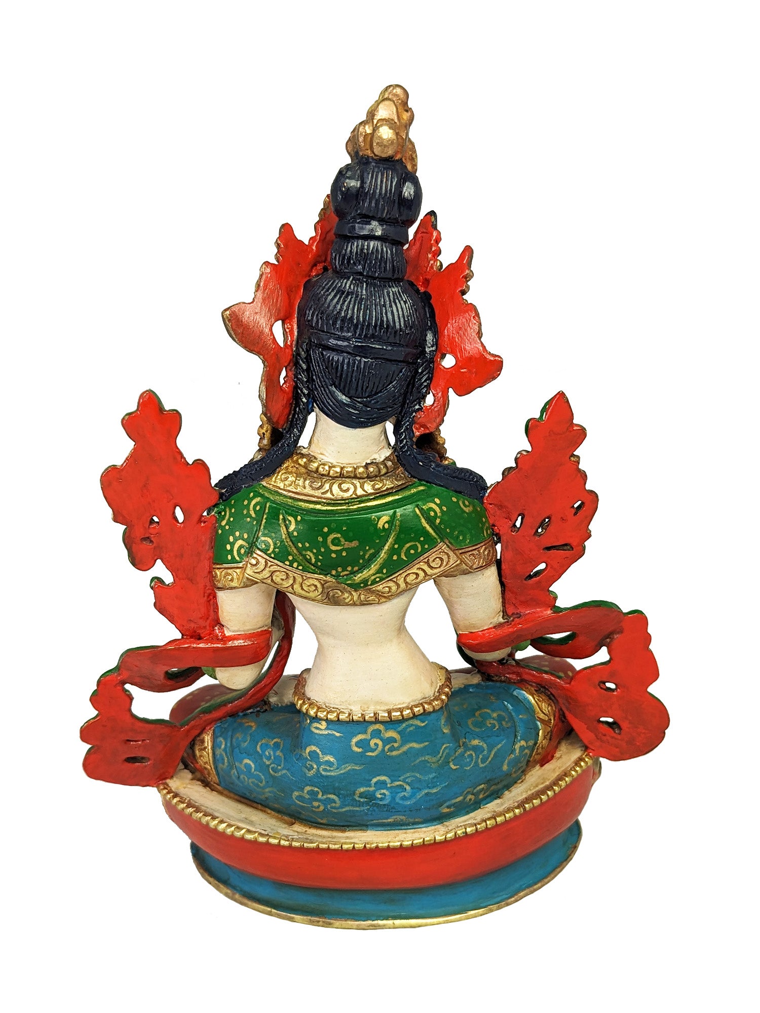 Beautiful gold-plated and hand-painted statue of White Tara made in Nepal. Tara or Jetsun Dolma is a female Bodhisattva who is known as the "mother of liberation", and represents the female aspect of enlightened mind. White tara is the longevity form of Tara. This is a unique, one-of-a-kind statue for your shrine, or to give as a gift.