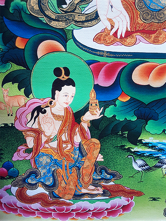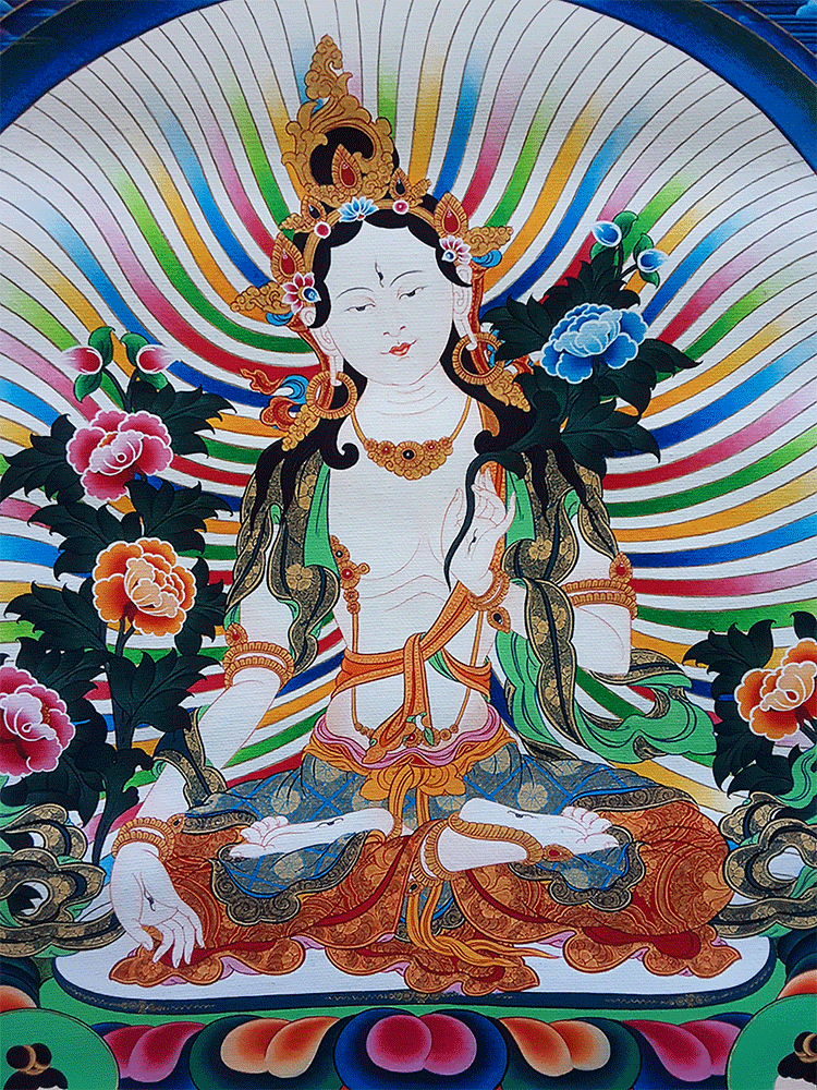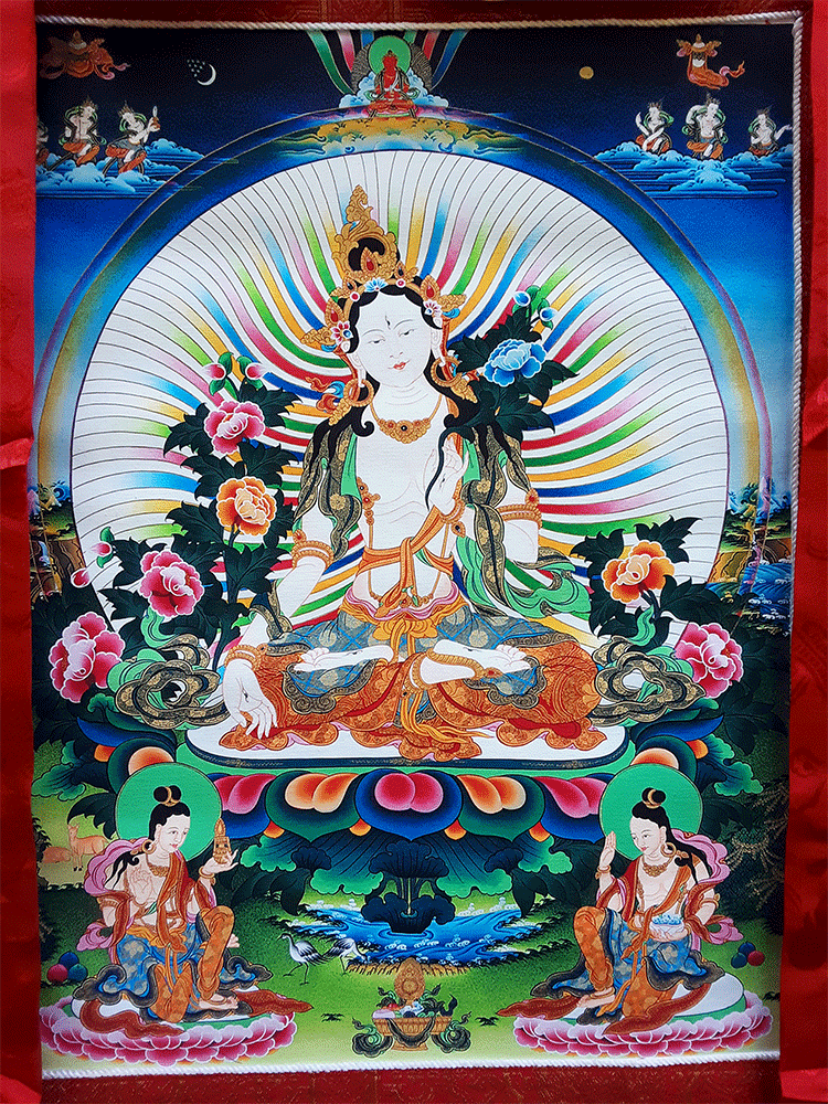 Beautiful print thangka from Nepal depicting White Tara. Tara, or "She who liberates," is a female deity who is known for her swift protection for those who call upon her, as well as her enlightened activity and compassion. Tara has been known by many names: Sarasvati, Mandarava, Yeshe Tsogyal. Often considered the patron protector of Tibet, she is the female aspect of enlightened mind, the embodiment of absolute bodhicitta. Tara will never abandon a practitioner in need. White Tara, in particular, is related to longevity and protection so that one may be of ultimate benefit to self and others. Included in this thangka are Namgyalma and Amitayus, the other two main longevity deities.
