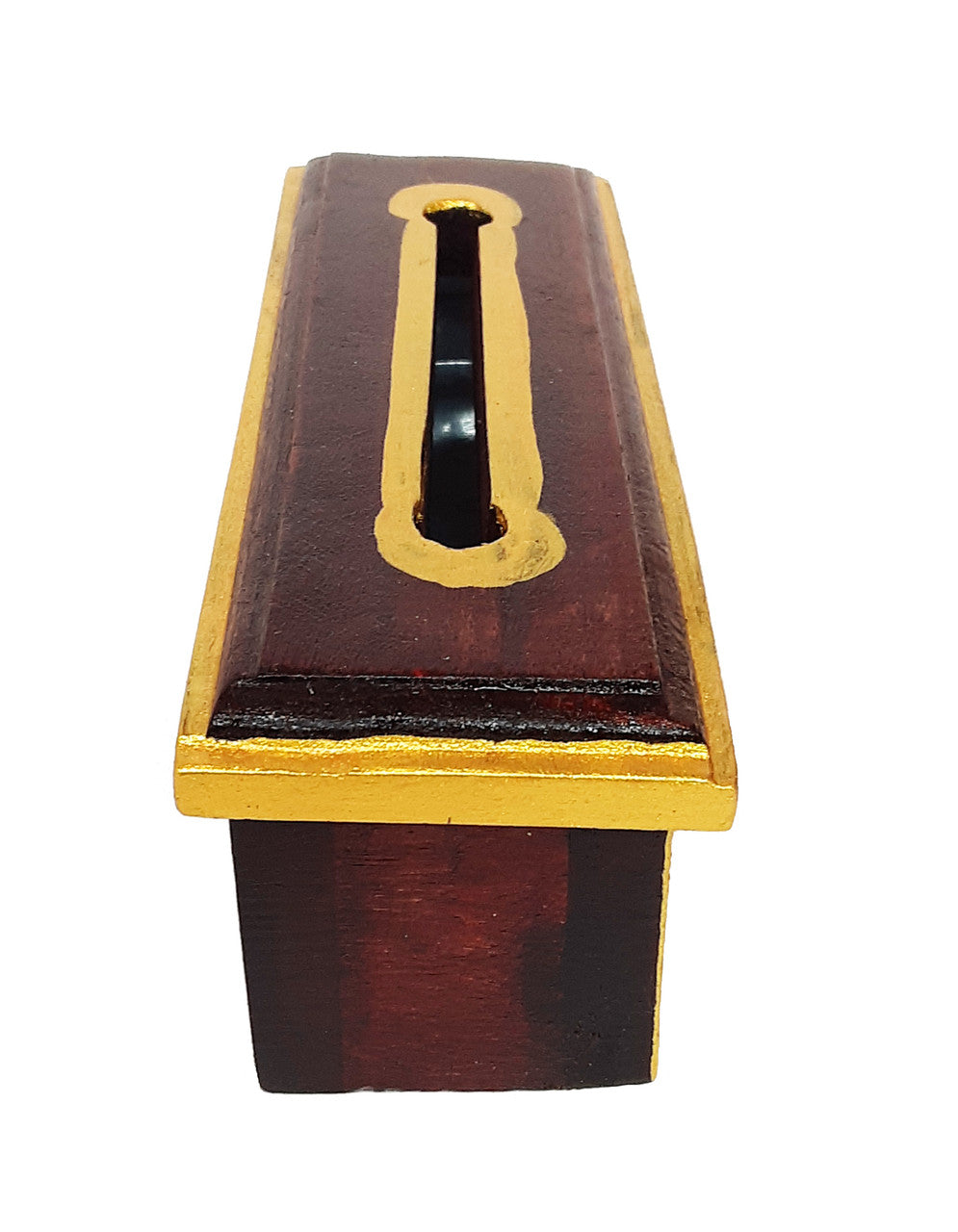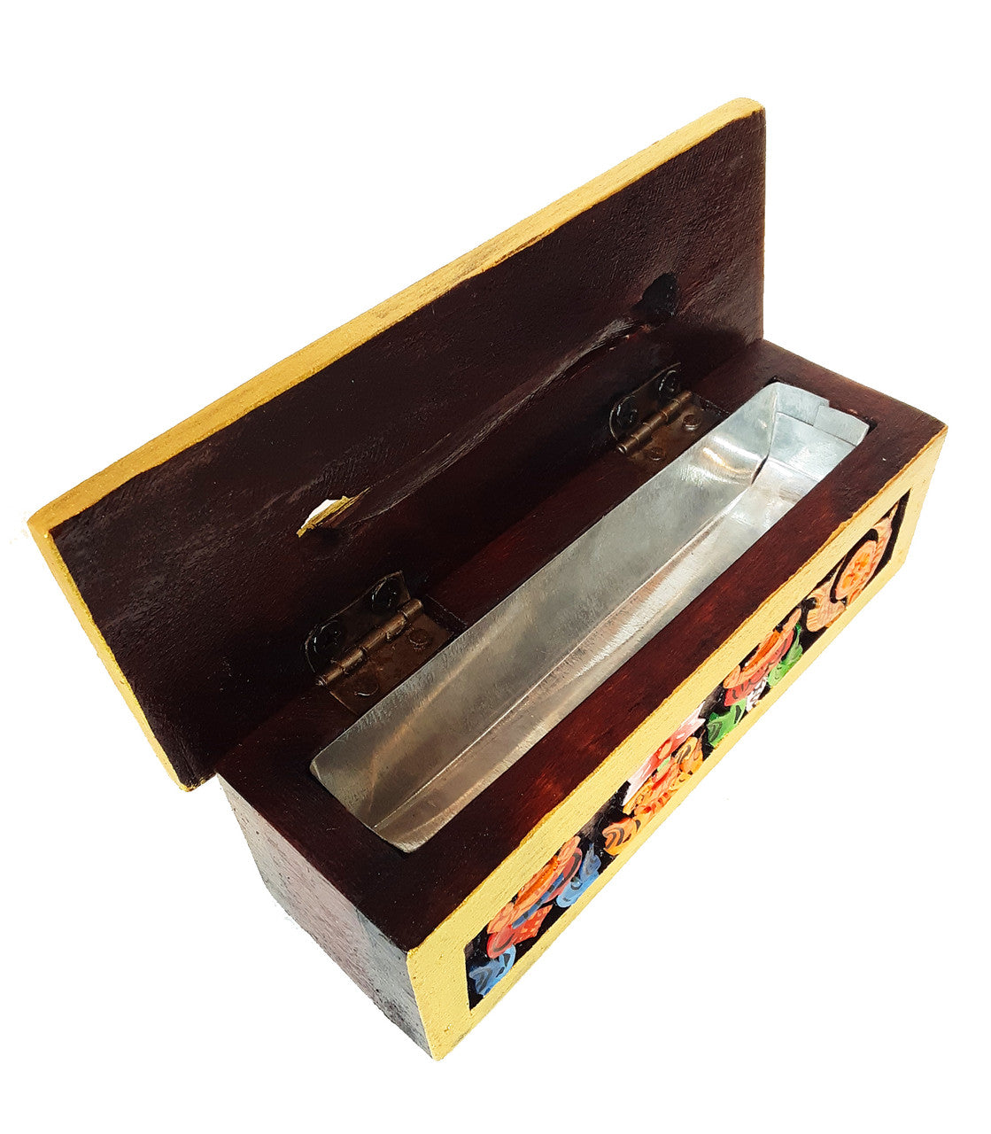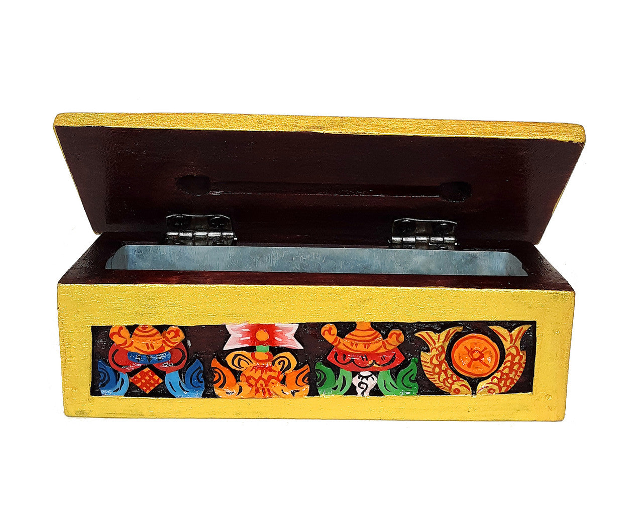 Adorable 7 inch wooden incense burner with gold trim and inlaid painted carvings of the 8 auspicious symbols combined into 4 sets of 2. From left to right: Victory banner with infinite knot, Lotus with treasure vase, parasol with conch shell, and Dharma wheel with golden fish. The inside of the vessel is lined with a metal basin, which can be filled with pebbles or sand. Incense is then burned on top of this. Optionally, the lid can be closed while the incense is burning, for it has a long opening which allows the smoke to waft upward. This lovely incense burner would make a perfect gift. It would also be quite suitable for altars with limited space, or for a travel shrine, while on the go. The combination of the metal inner lining and the ability for the lid to close while burning, makes this incense burner particularly fire safe.