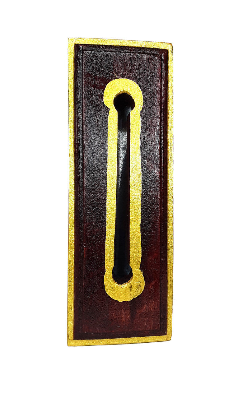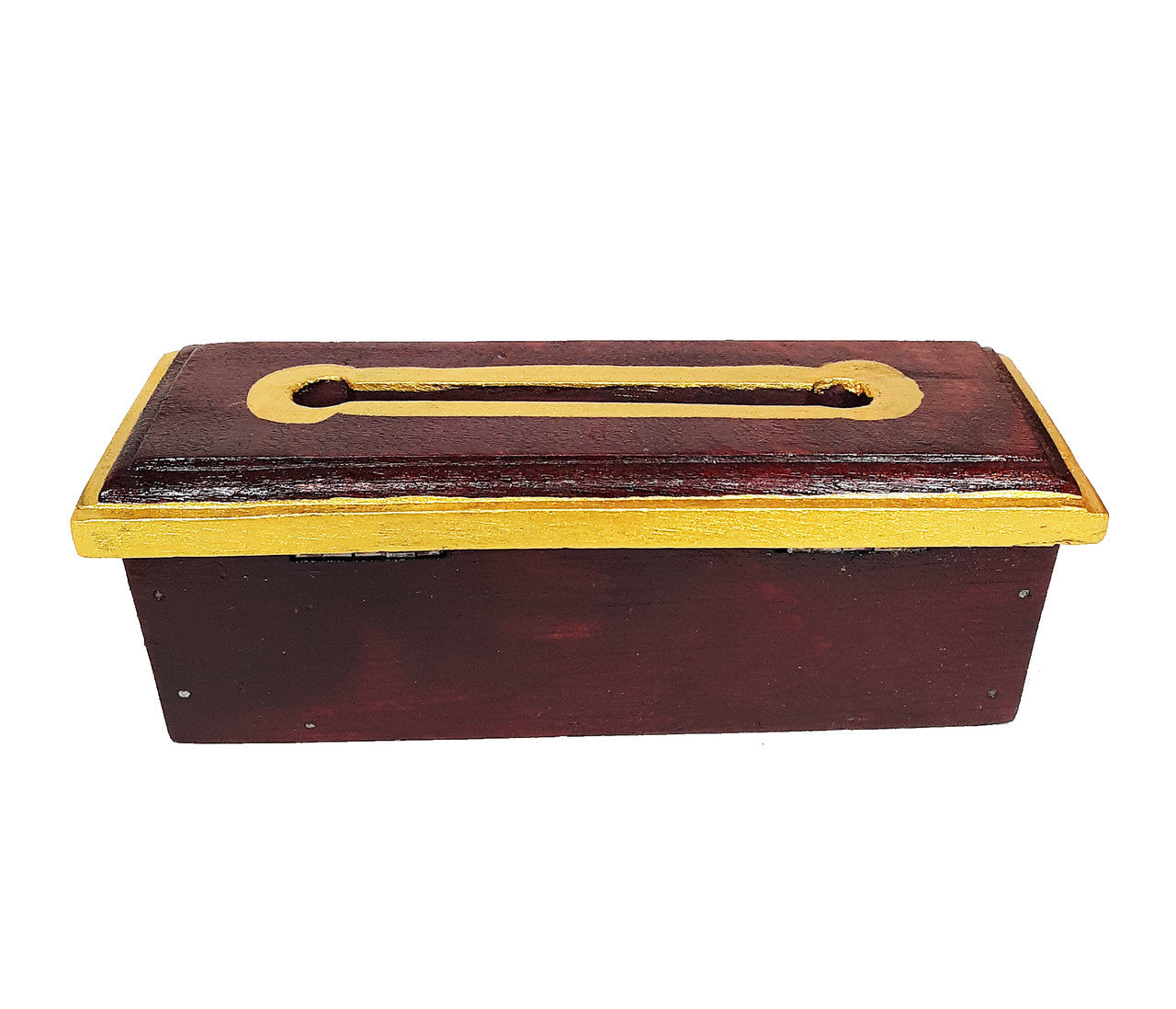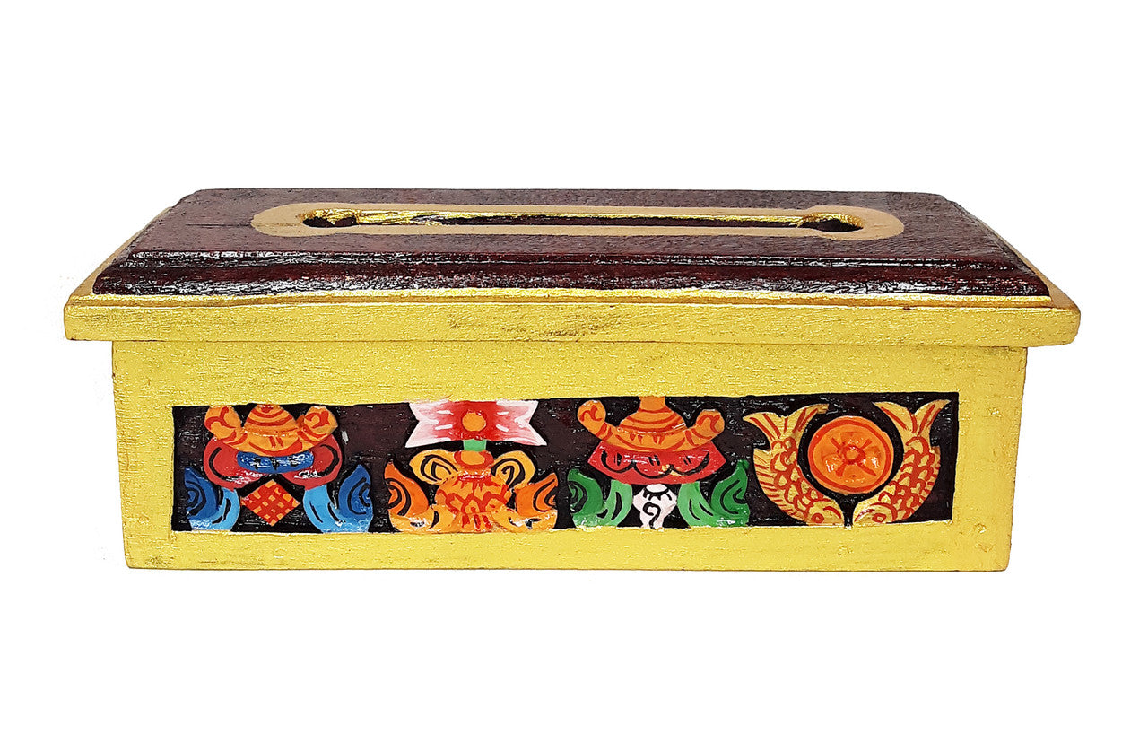 Adorable 7 inch wooden incense burner with gold trim and inlaid painted carvings of the 8 auspicious symbols combined into 4 sets of 2. From left to right: Victory banner with infinite knot, Lotus with treasure vase, parasol with conch shell, and Dharma wheel with golden fish. The inside of the vessel is lined with a metal basin, which can be filled with pebbles or sand. Incense is then burned on top of this. Optionally, the lid can be closed while the incense is burning, for it has a long opening which allows the smoke to waft upward. This lovely incense burner would make a perfect gift. It would also be quite suitable for altars with limited space, or for a travel shrine, while on the go. The combination of the metal inner lining and the ability for the lid to close while burning, makes this incense burner particularly fire safe.